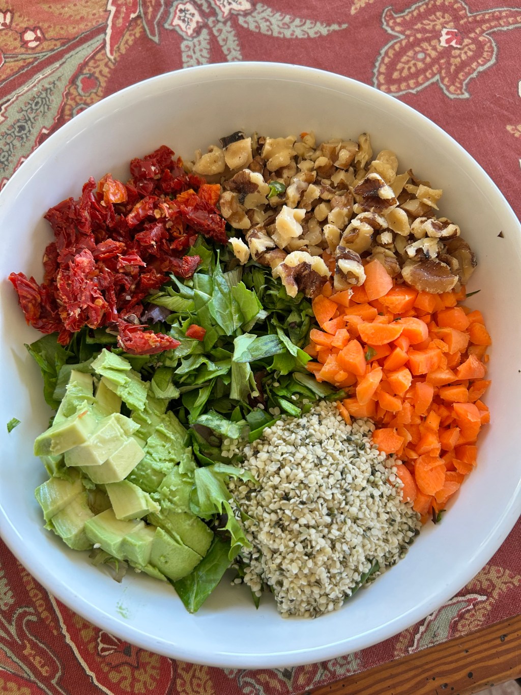 One easy way to increase daily veggie intake is to make a big salad for lunch. I always start with chopped-up greens, and then add whatever I have on hand or feel like eating that day. The options are endless – peppers, tomatoes (including tangy sun-dried), cucumbers, red onions, radishes, roasted vegetables like caulifllower, capers, olives, plus proteins like walnuts, almonds, hemp seeds, sunflower seeds, pepitas, hard-boiled eggs, cubed chicken, cheese….the variations are infinite!