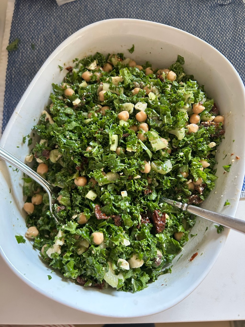 I love potluck suppers nowadays. No matter what the occasion- whether it’s a football game or a church social – everyone knows I’m good for a kale salad. Among the array of chips, breads and sweets, there’s something green and healthy that I can enjoy.