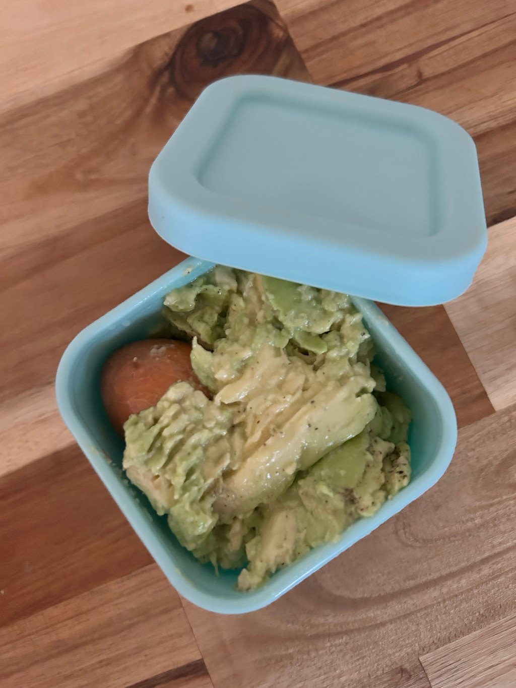 A little boring perhaps, so I’m excited about a new option I just figured out: fresh guacamole! One avocado, smashed with a bit of lemon, salt and pepper, fit nicely into this little silicone container I gave myself for Christmas. The lemon and the pit preserved it perfectly. I ate it with a spoon; it was delicious!